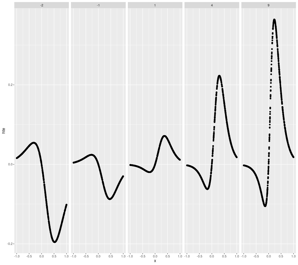 推定対象となるHTEをプロットすると次のようになります。上部の数値は処置効果の大きさのパラメータです。