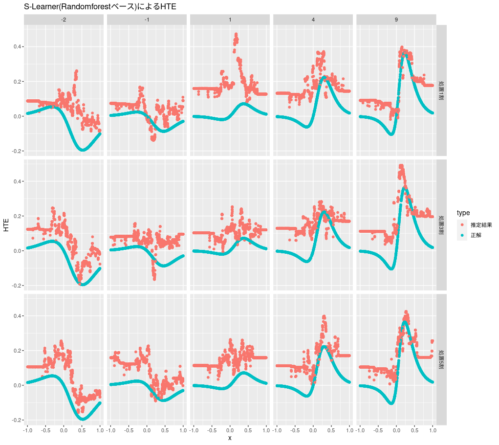 s_learner_rf <- function(d) { m <- randomForest(y ~ x + z, data = d) predict(m, d %>% mutate(z = 1), type = "response") - predict(m, d %>% mutate(z = 0), type = "response") } plot_hte(d, s_learner_rf, "S-Learner(Randomforestベース)によるHTE")