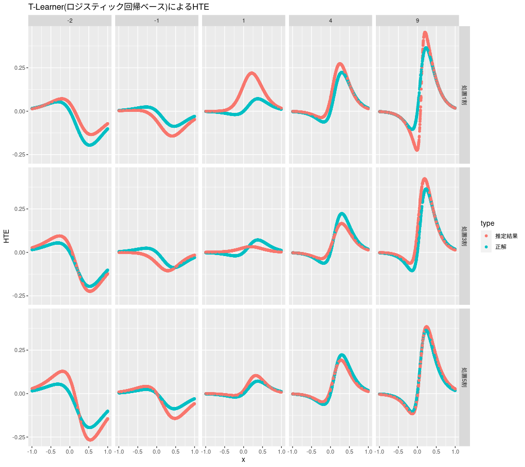大きなピークはある程度捉えられているようですが、正負が反対のピークは捉えられていません。ロジスティック回帰ベースのS-Learnerでは、HTEを算出するモデル式の極値が一つしかないので2つのピークは表現できません。大きなピークのみを捉えるだけでよいケースでしか使えないので、利用用途が限られそうです。