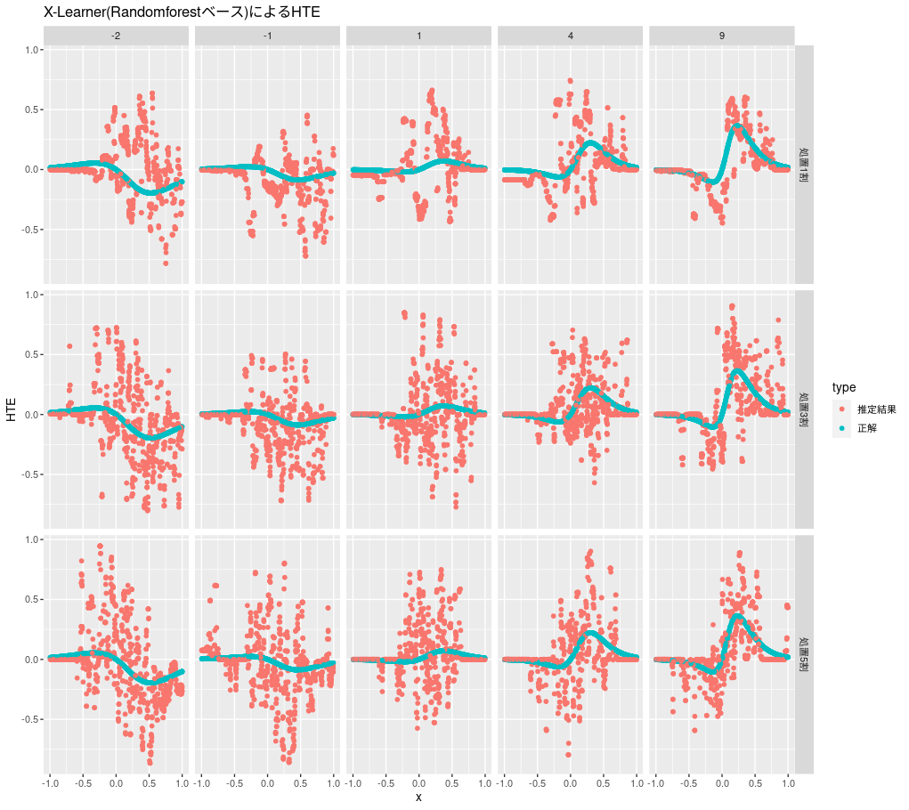 x_learner <- function(d) { d0 <- d %>% filter(z == 0) d1 <- d %>% filter(z == 1) m0 <- randomForest(y ~ x, data = d0) m1 <- randomForest(y ~ x, data = d1) # imputed treatment effects D0 <- predict(m1, d0, type = "response") - d0$y D1 <- d1$y - predict(m0, d1, type = "response") m0_x <- randomForest(D0 ~ x, d0) m1_x <- randomForest(D1 ~ x, d1) g <- glm(z ~ x, d, family = "binomial") e <- predict(g, d, type = "response") e * predict(m0_x, d, type = "response") + (1 - e) * predict(m1_x, d, type = "response") } plot_hte(d, x_learner, "X-Learner(Randomforestベース)によるHTE")
