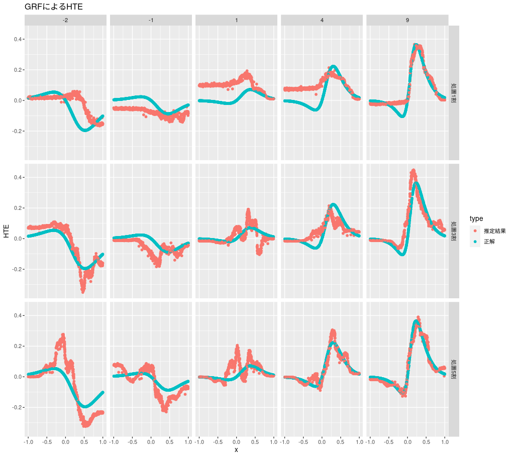 grf_wrapper <- function(d) { tau.forest <- causal_forest(X = as.matrix(d$x), Y = d$y, W = d$z) predict(tau.forest)$predictions } plot_hte(d, grf_wrapper, "GRFによるHTE")